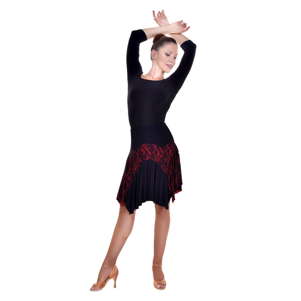 Εξαιρετική λάτιν χορευτική φούστα με μαύρα σχέδια δαντέλας σε κόκκινο φόντο. Ιδανικό για πρόβα ή ακόμα και την παράσταση. Κατασκευασμένο από υλικά Super Jersey και Lace άριστης ποιότητας, για να μην δημιουργεί πρόβλημα στην κίνηση αλλά και στο δέρμα σας. Μπορείτε να το συνδυάσετε με το Κορμάκι της αρεσκείας σας και ένα Σέξι Διχτυωτό Καλσόν.