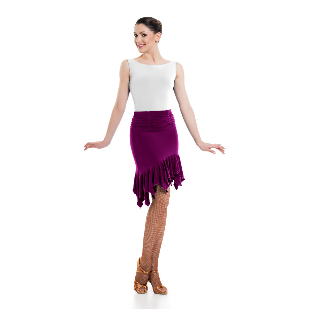 Γυναικεία φούστα για οποιαδήποτε αίθουσα χορού και κοινωνική εμφάνιση, κατασκευασμένη από την καλύτερη ποιότητα Super Jersey ή Meryl. Νιώστε τη μουσική, ζήστε την κίνηση και χορέψτε με πάθος με αυτή την εφαρμοστή και ελαστική φούστα που αγκαλιάζει το σώμα σας, χωρίς να εμποδίζει τις κινήσεις σας. Η μπάσκα στο επάνω μέρος είναι μαζεμένη, ενώ διαθέτει και βολάν στο στρίφωμα. Φορέστε το μαζί με ένα όμορφο κορμάκι και καλσόν χορού για την ολοκληρωση του look.