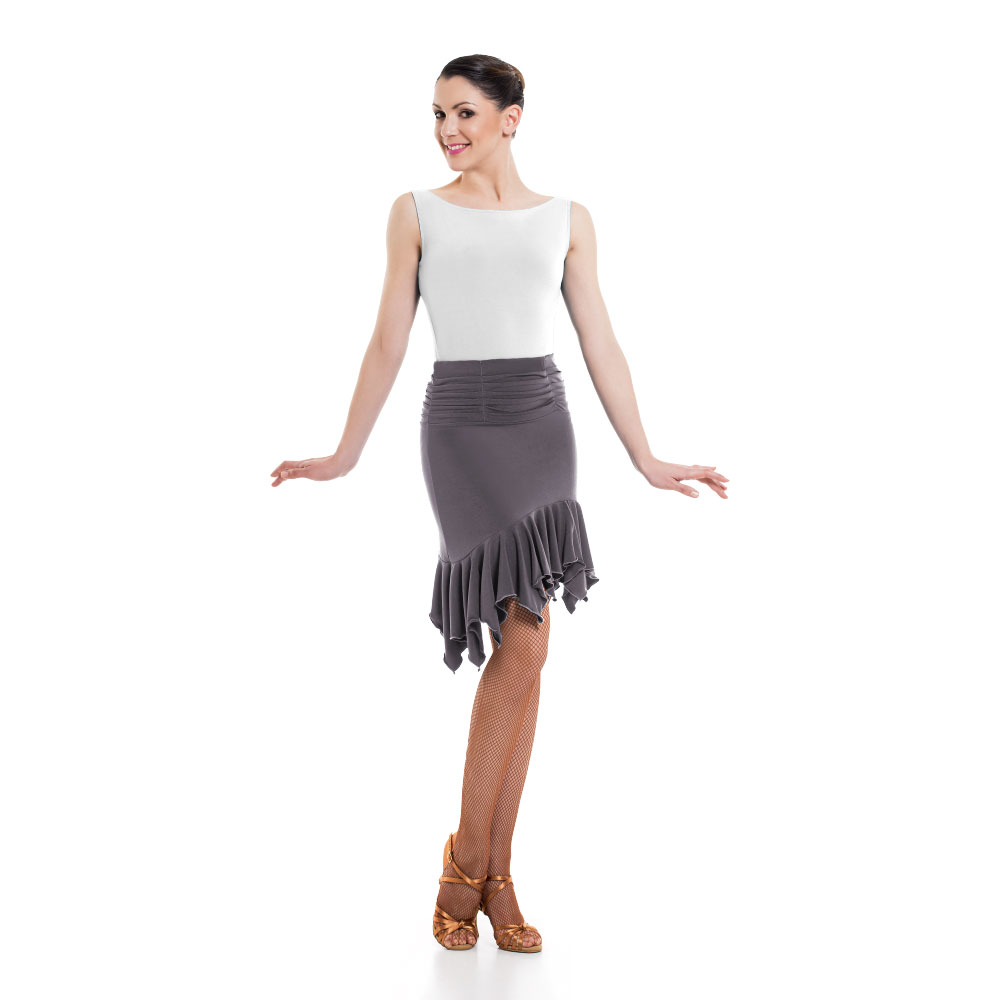 Γυναικεία φούστα για οποιαδήποτε αίθουσα χορού και κοινωνική εμφάνιση, κατασκευασμένη από την καλύτερη ποιότητα Super Jersey ή Meryl. Νιώστε τη μουσική, ζήστε την κίνηση και χορέψτε με πάθος με αυτή την εφαρμοστή και ελαστική φούστα που αγκαλιάζει το σώμα σας, χωρίς να εμποδίζει τις κινήσεις σας. Η μπάσκα στο επάνω μέρος είναι μαζεμένη, ενώ διαθέτει και βολάν στο στρίφωμα. Φορέστε το μαζί με ένα όμορφο κορμάκι και καλσόν χορού για την ολοκληρωση του look.
