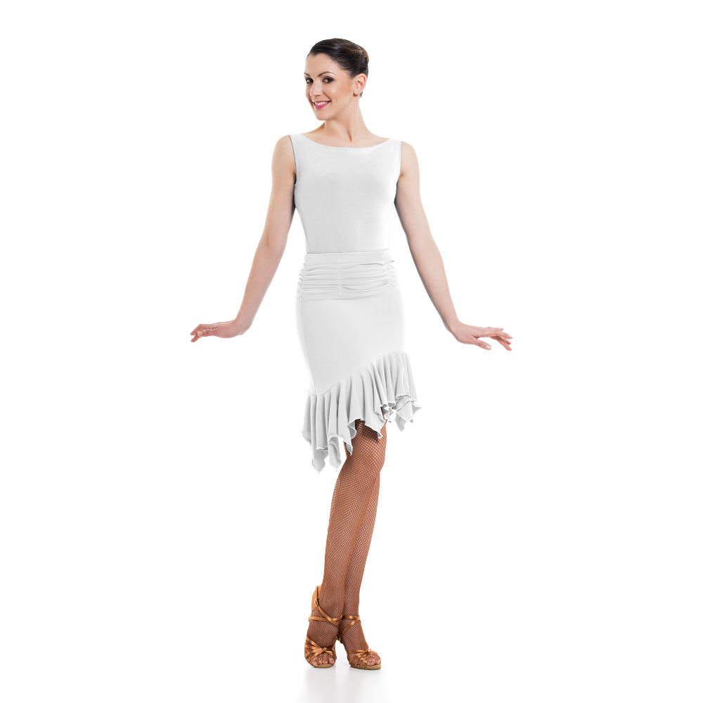 Γυναικεία φούστα για οποιαδήποτε αίθουσα χορού και κοινωνική εμφάνιση, κατασκευασμένη από την καλύτερη ποιότητα Super Jersey ή Meryl. Νιώστε τη μουσική, ζήστε την κίνηση και χορέψτε με πάθος με αυτή την εφαρμοστή και ελαστική φούστα που αγκαλιάζει το σώμα σας, χωρίς να εμποδίζει τις κινήσεις σας. Η μπάσκα στο επάνω μέρος είναι μαζεμένη, ενώ διαθέτει και βολάν στο στρίφωμα. Φορέστε το μαζί με ένα όμορφο κορμάκι και καλσόν χορού για την ολοκληρωση του look.