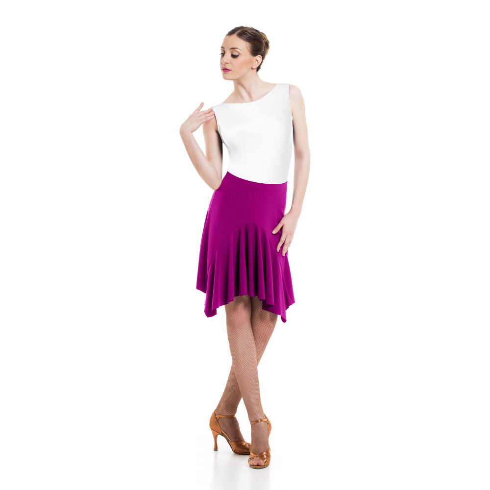 Latin skirt made by the finest quality Super Jersey or Meryl. Feel the music, experience the movement and dance with passion with that fitted and elastic skirt that hugs your body, without obstructing any of your movements. Featuring ruffled sections to the front and back on the back for the perfect optical results. Wear it alongside a beautiful leotard and tights.