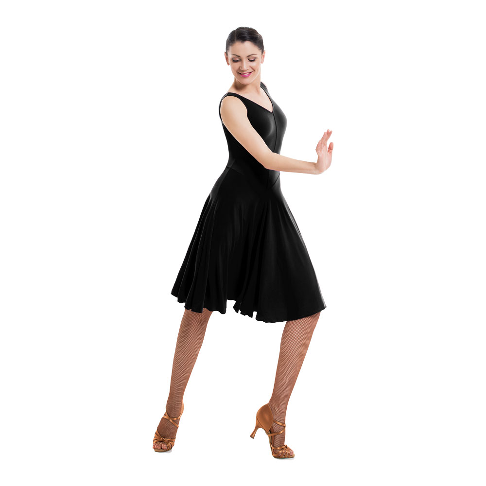 A high-quality dance leotard with a knee-length, wide, swinging skirt. The combination of leotard and dance dress gives a unique fit, without annoying fabric slipping at the waistband. The figure-hugging line with a V-neck and discreet back ensures incomparable elegance for tango or other character dances.