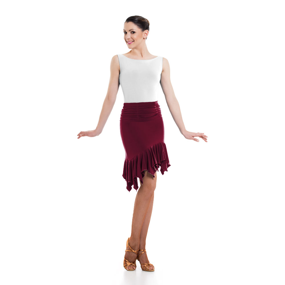 Female ballroom and social dance skirt made by the finest quality Super Jersey or Meryl fabrics. Feel the music, experience the movement and dance with passion with that fitted and elastic skirt that hugs your body, without obstructing any of your movements. Featuring gathered yoke on top and an asymmetric ruffle at the hem. Wear it alongside a beautiful leotard and tights.