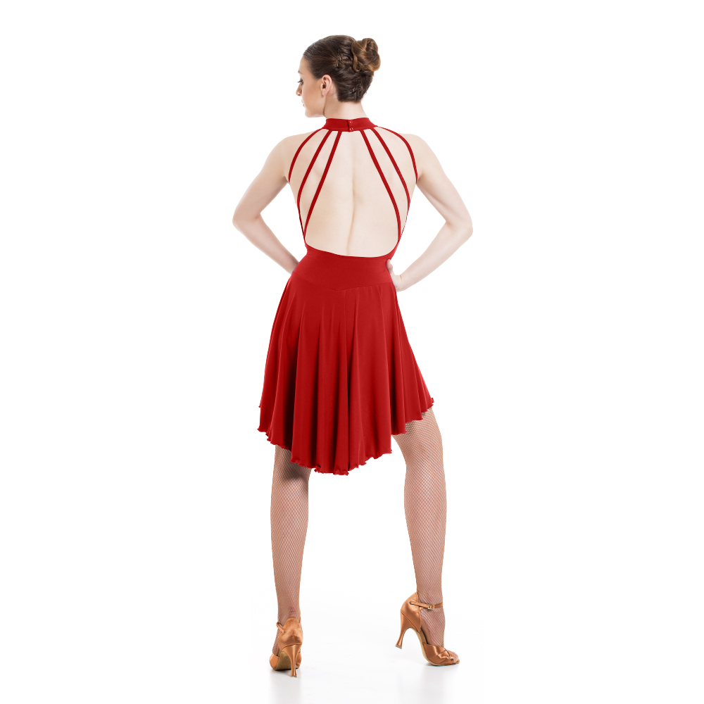 Latin leotard dressmade by the finest quality Super Jersey or Meryl. Feel the music, experience the movement and dance with passion with that fitted leotard and elastic asymmetric skirt that hugs your body, without obstructing any of your movements. Featuring ruffled sections to the front and back for the perfect optical results. Wear it alongside fishnet tights.