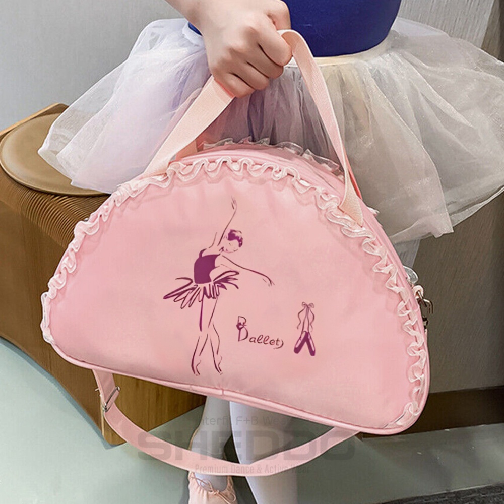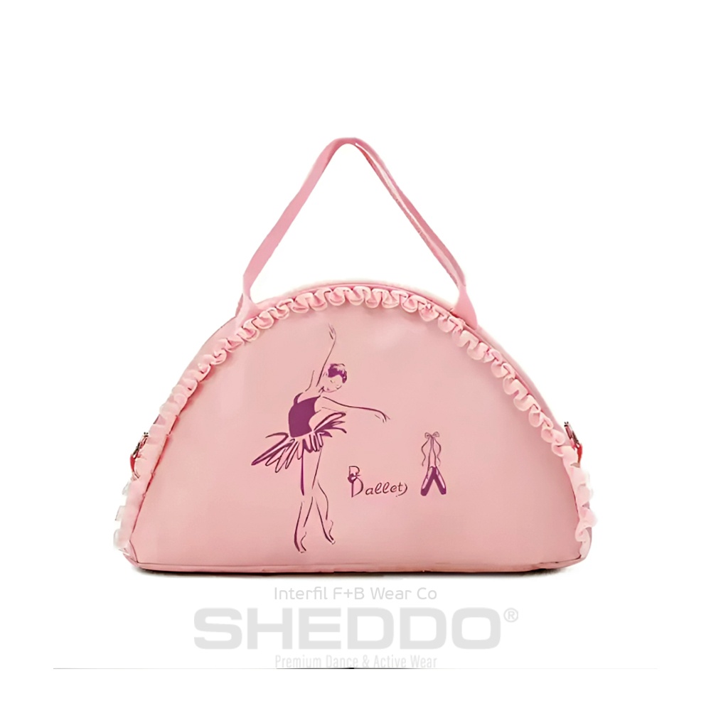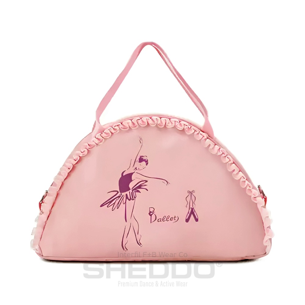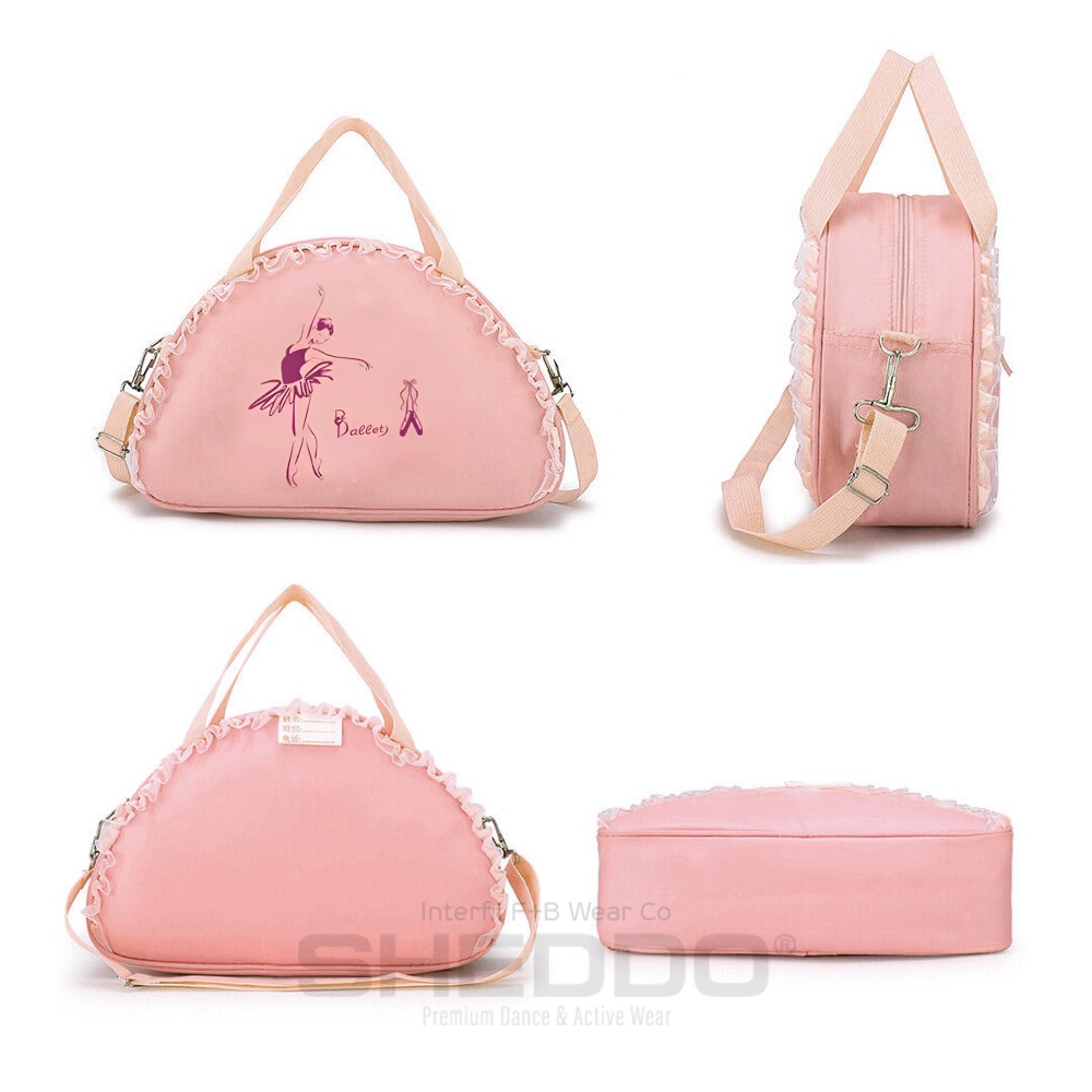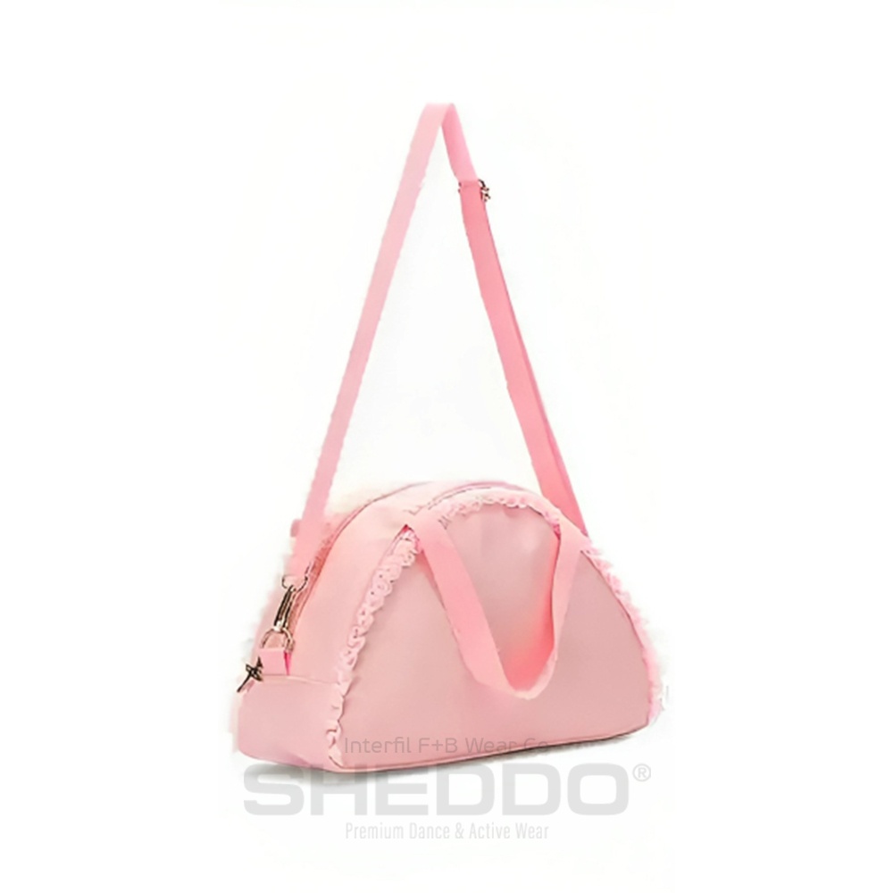Nylon made, activities duffel bag for children with single zipper on top. It is made out of premium nylon material and it features silver, white and pink tulle around the edges. It can be carried using the hand handles, or the included shoulder strap.
