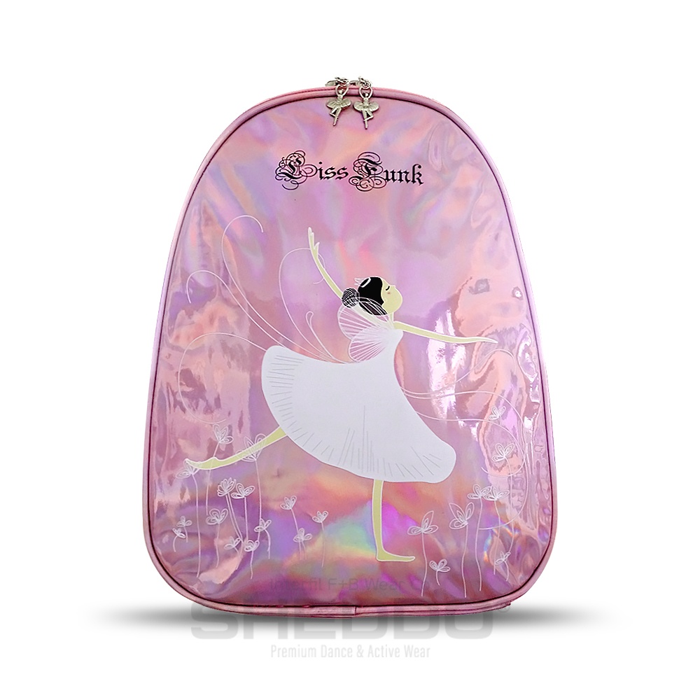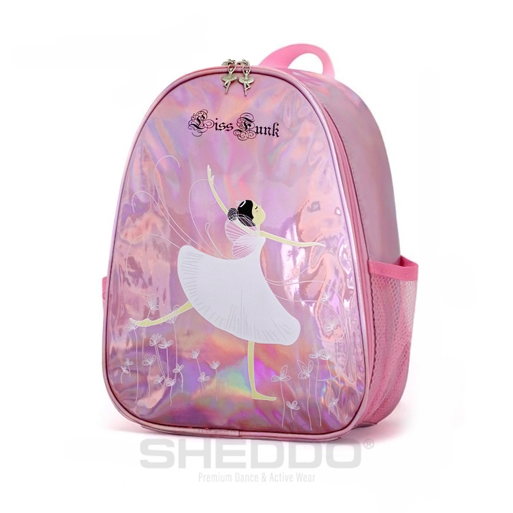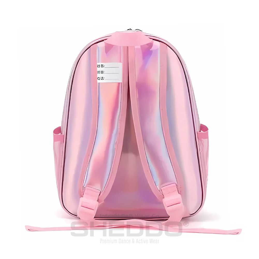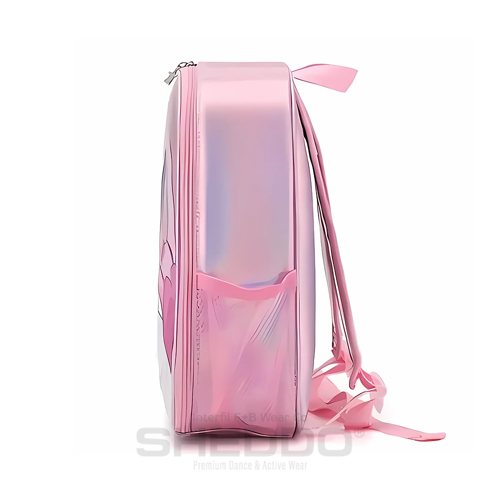 Metallic pink backpack for kids, with side nets and a small pocket inside.