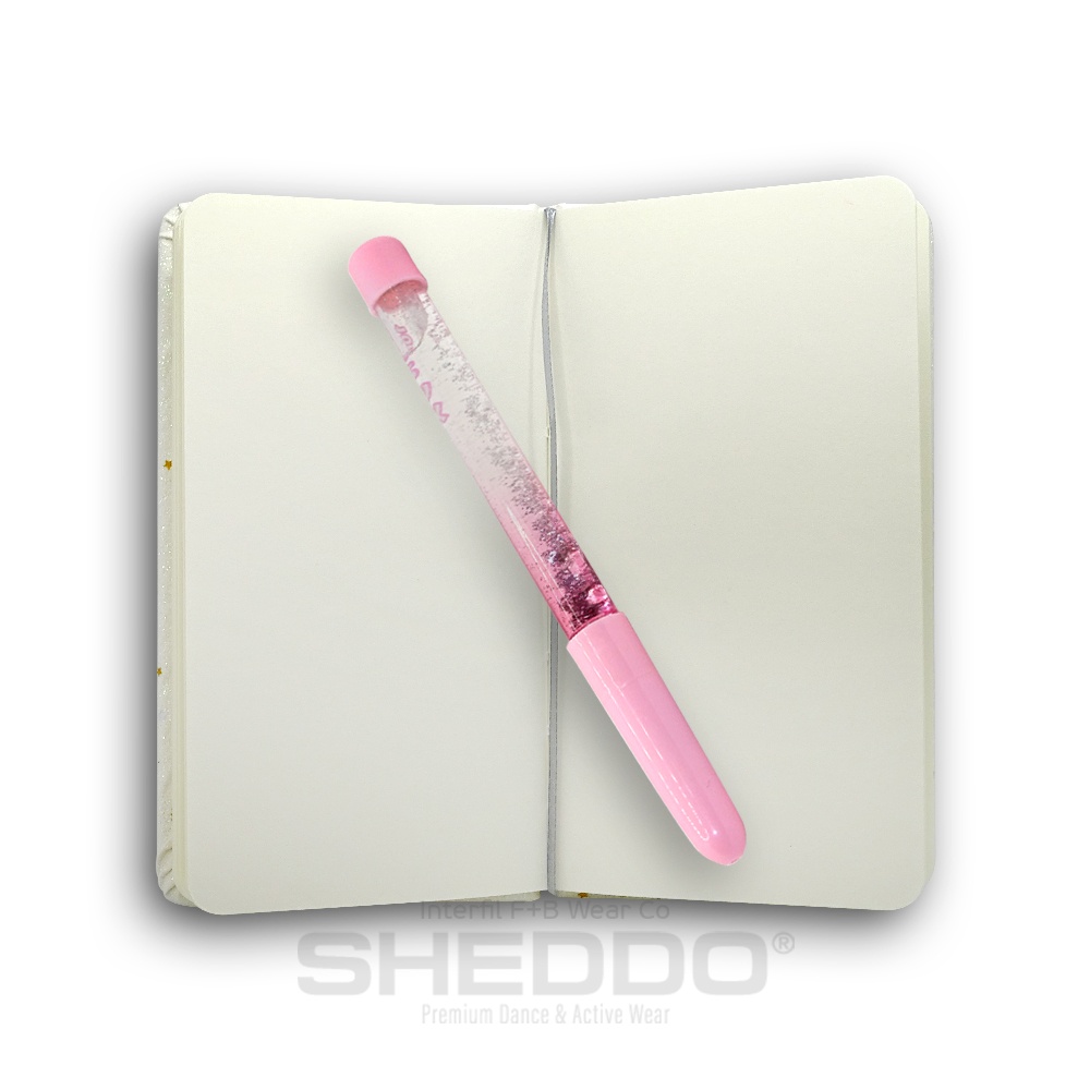 Notebook set featuring a 16cm black liquid Ball pen with a tip of 0.5mm and Glitter.