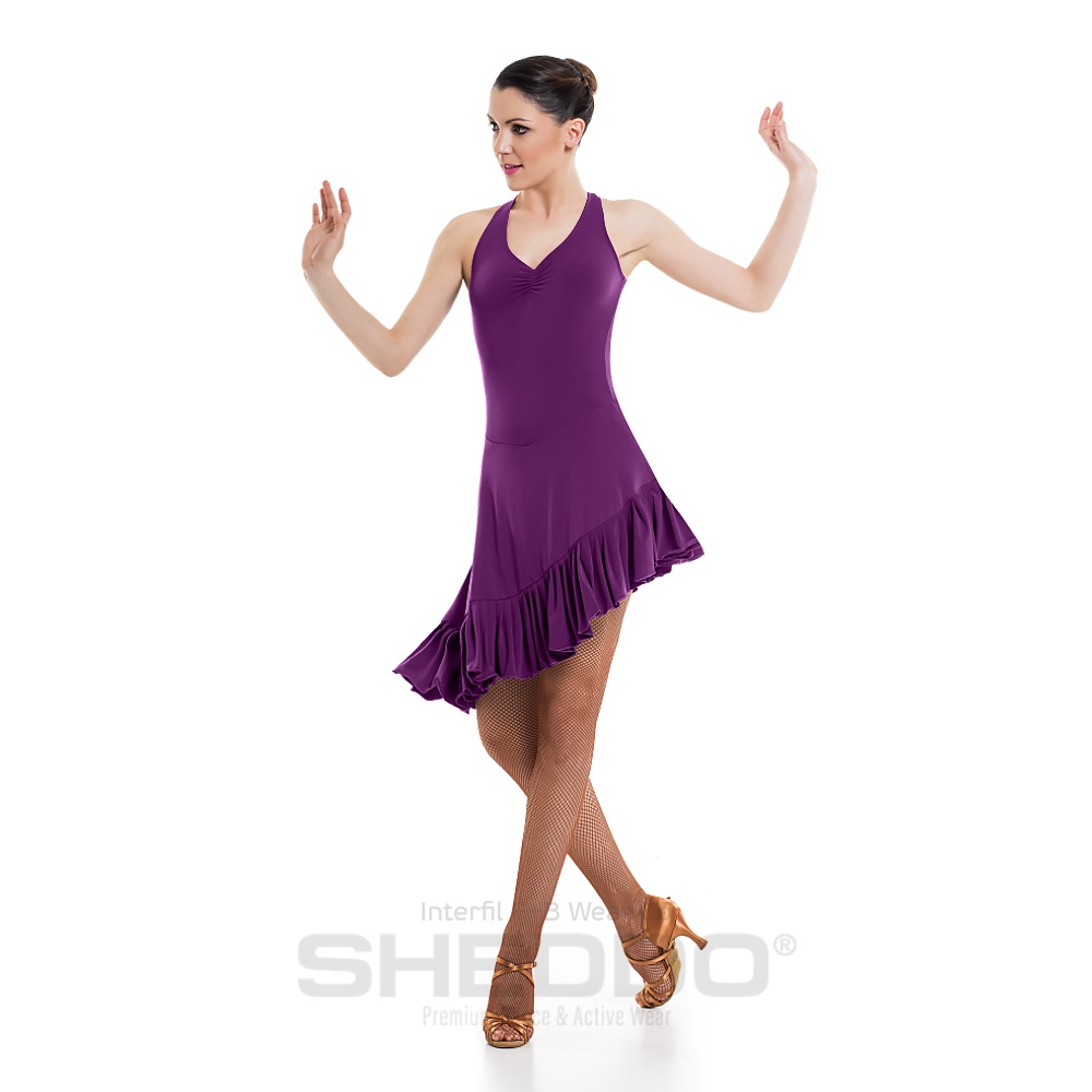 Latin leotard dress, made by the finest quality Super Jersey or Meryl. Feel the music, experience the movement and dance with passion with that fitted leotard and elastic asymmetric skirt that hugs your body, without obstructing any of your movements. Featuring ruffled sections to the front and back for the perfect optical results. Wear it alongside fishnet tights.