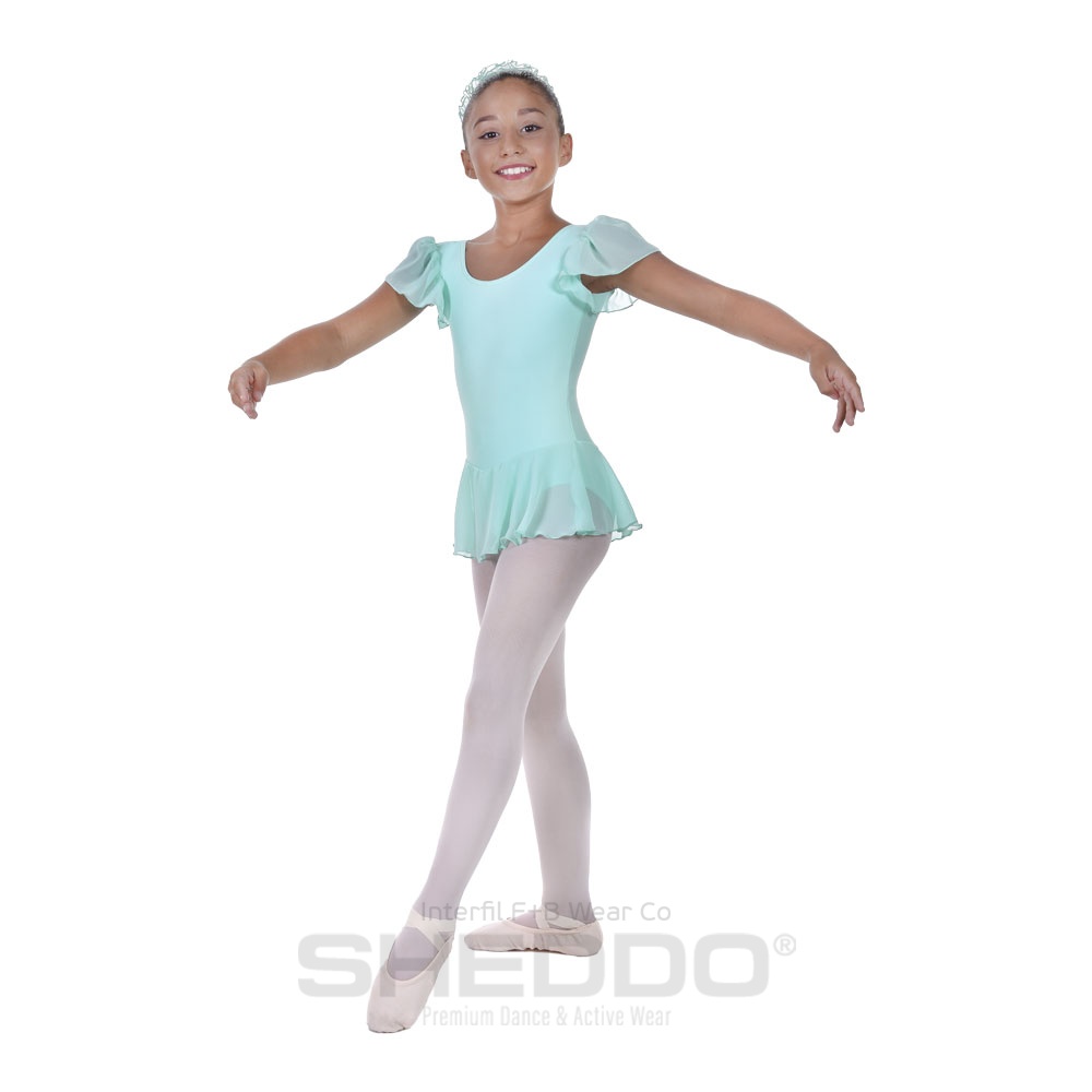 Leotard dress whit a classic front cut, that embellishes beautifully the neckline. The skirt makes the whole look more interesting, especially with the pal colours, while the finest Lycra ensures comfort and the freedom of movement. It can be worn with a scrunchie in white and classic pointe shoes!