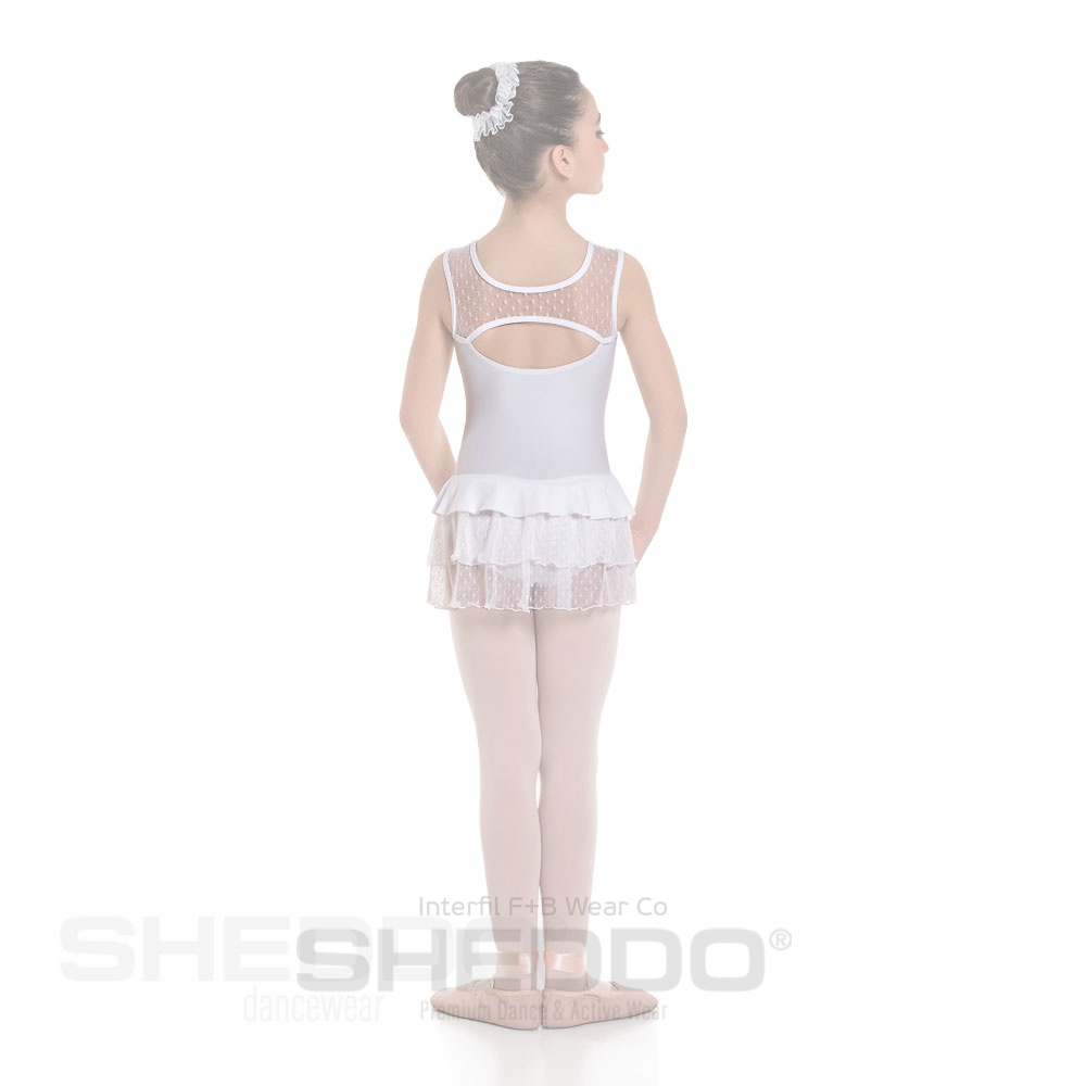 Girls Seamless Leotard with Hole on the Back & 3 Layered Polka Dots Tulle Skirt, Lycra - Tulle White