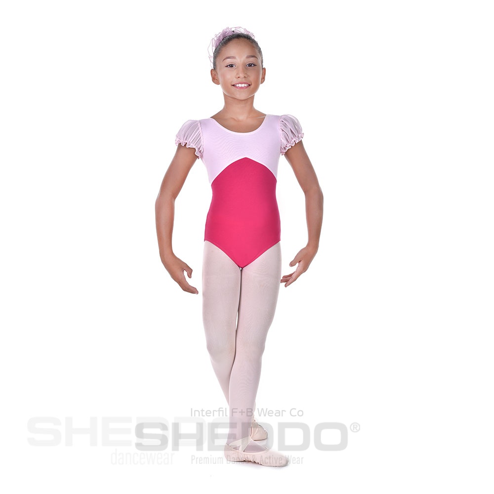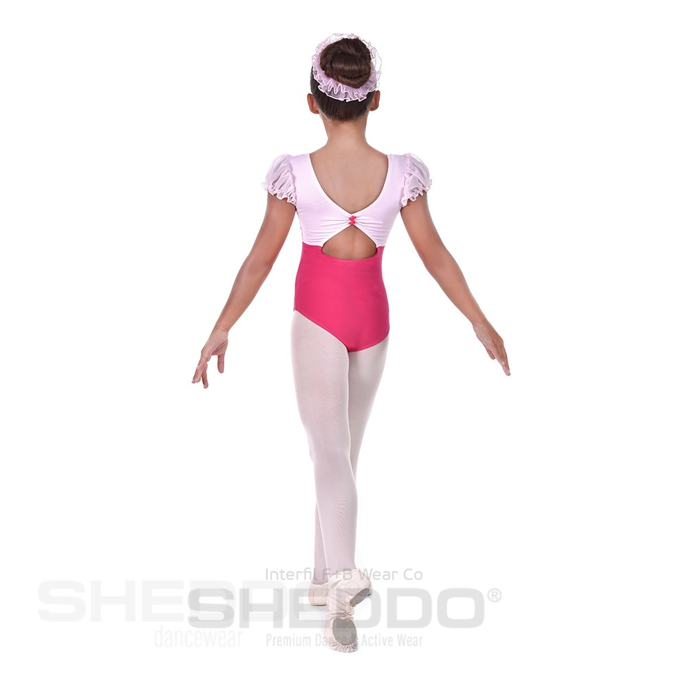 Girls Bicoloured Puff Sleeved Leotard Pinched Key Hole, Cotton - Elastane Light Pink & Fuchsia