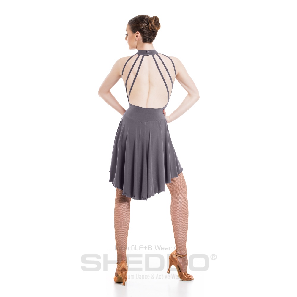 Latin leotard dressmade by the finest quality Super Jersey or Meryl. Feel the music, experience the movement and dance with passion with that fitted leotard and elastic asymmetric skirt that hugs your body, without obstructing any of your movements. Featuring ruffled sections to the front and back for the perfect optical results. Wear it alongside fishnet tights.