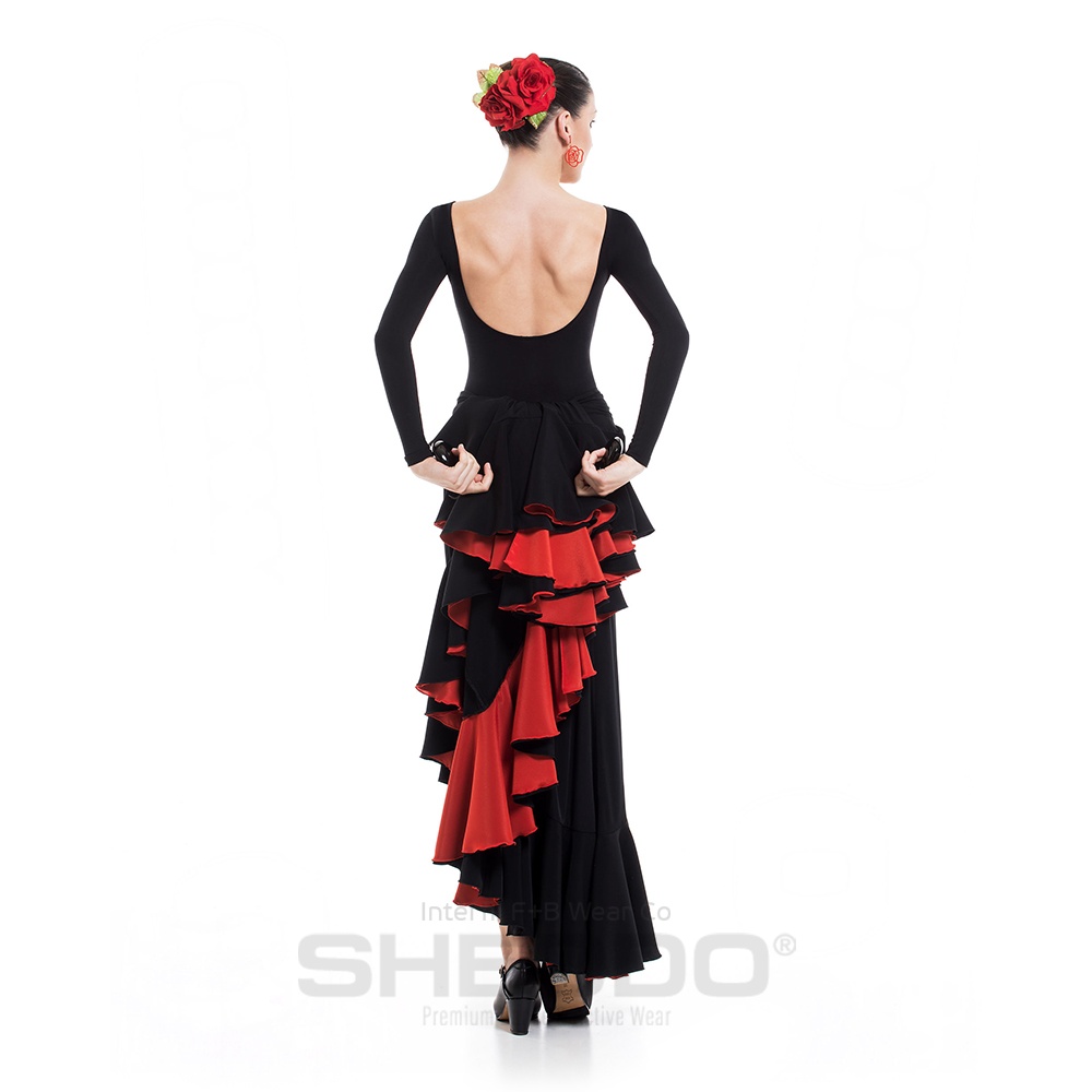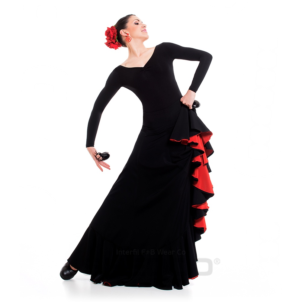 Wake the flamencista inside of you with this exceptional piece of Spanish Culture. Made by the best Marocain fabric, it is really soft to the touch, comfortable and it does not disrupt the flow of the movement. This professional flamenco dance skirt comes in black and red color, which consists of six sheets of fabric and features an internal elastic cord to provide better fit and grip. Pair it with a monochrome leotard, hair flowers, hats or nets and suitable character shoes!