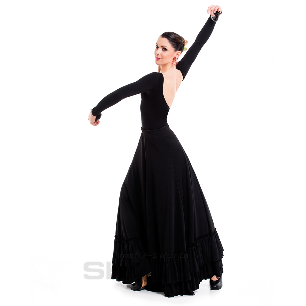 Wake the flamencista inside of you with this exceptional piece of Spanish Culture. Made by the best Marocain fabric, it is really soft to the touch, comfortable and it does not disrupt the flow of the movement. This professional flamenco dance skirt comes in black color, which consists of eight sheets of fabric and features an internal elastic cord to provide better fit and grip. Pair it with a monochrome leotard, hair flowers, hats or nets and suitable character shoes!