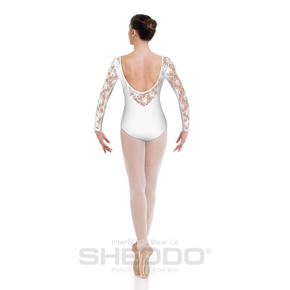 Female Long Sleeved Leotard L/Back Upper Lace Bodice, Lycra Matt White