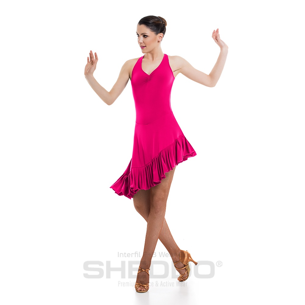 Latin leotard dress, made by the finest quality Super Jersey or Meryl. Feel the music, experience the movement and dance with passion with that fitted leotard and elastic asymmetric skirt that hugs your body, without obstructing any of your movements. Featuring ruffled sections to the front and back for the perfect optical results. Wear it alongside fishnet tights.