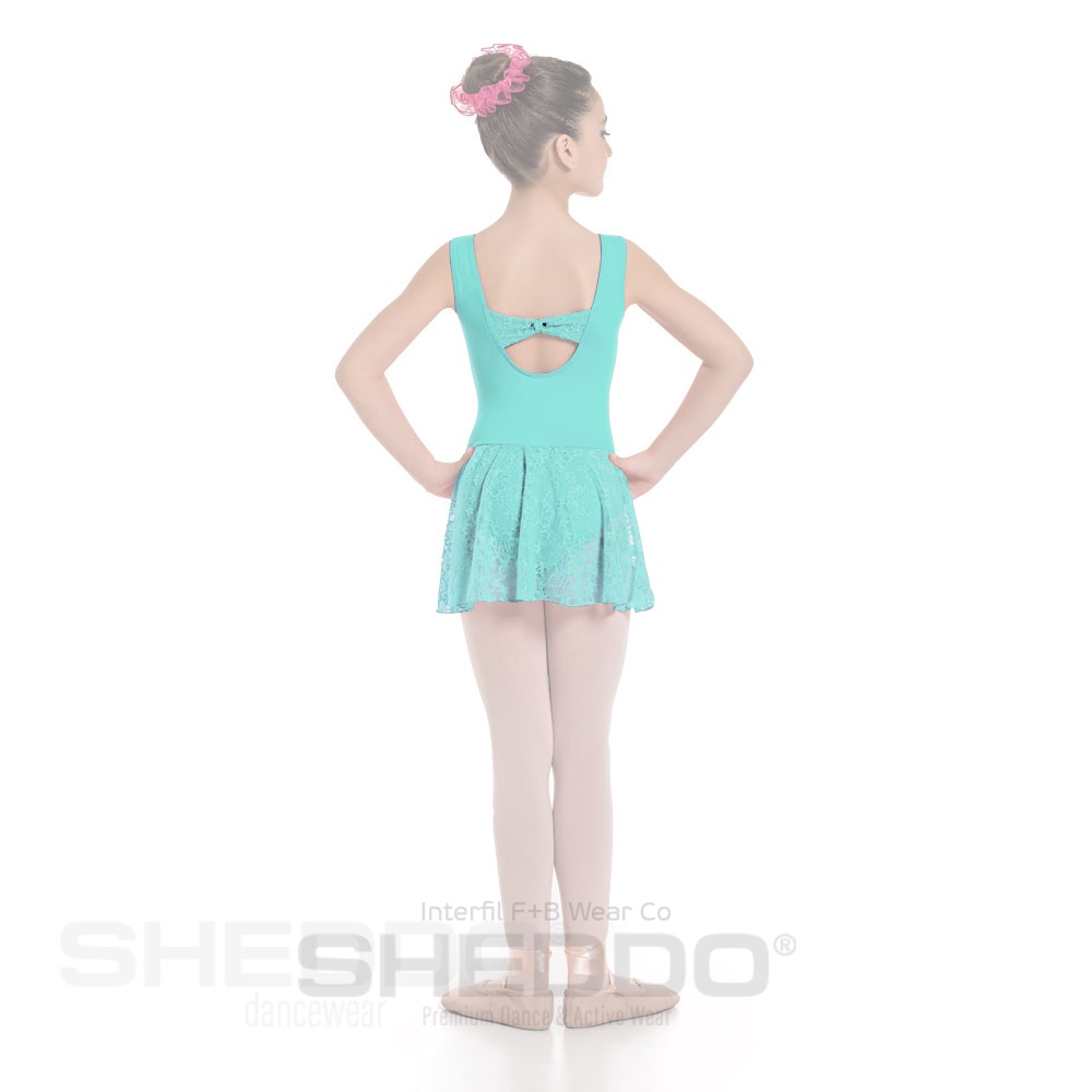 Girls tank leotard with lace front bust and a crossover lace skirt, made by excellent quality Lycra matt.