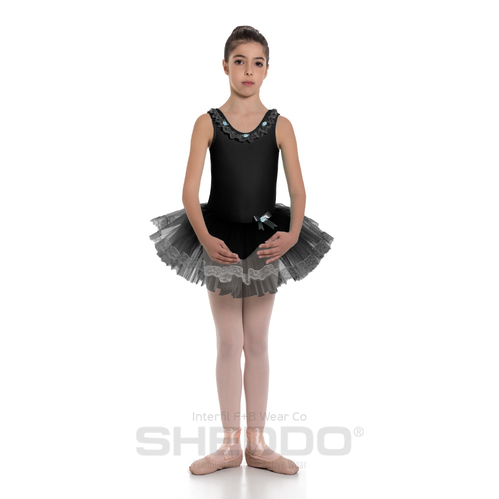 Girls Tank Leotard With Tulle Skirt & Lace Decor, Black