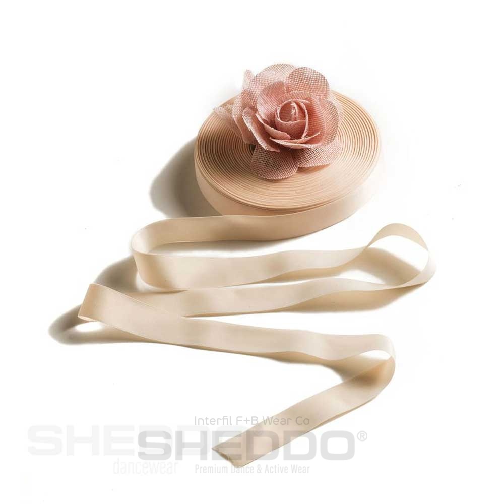 Pointe double faced ribbon in a roll of 50 meters made by nylon. It is sold in a neutral, pink colour. It's thickness is 25mm.
